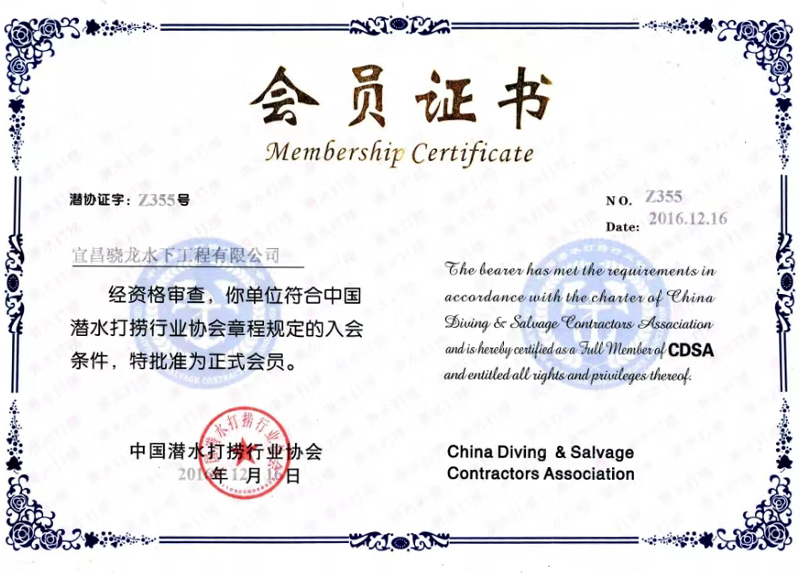 中國潛水大佬行業(yè)協(xié)會會員證書